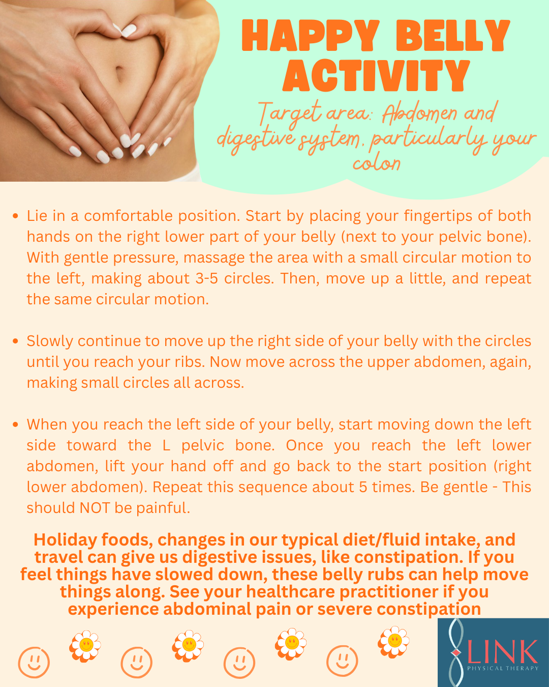 Changes in holiday eating habits, travel, and disrupted routines can slow digestion and lead to constipation. These gentle belly rubs may help stimulate movement and support healthy digestion.